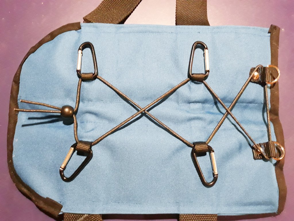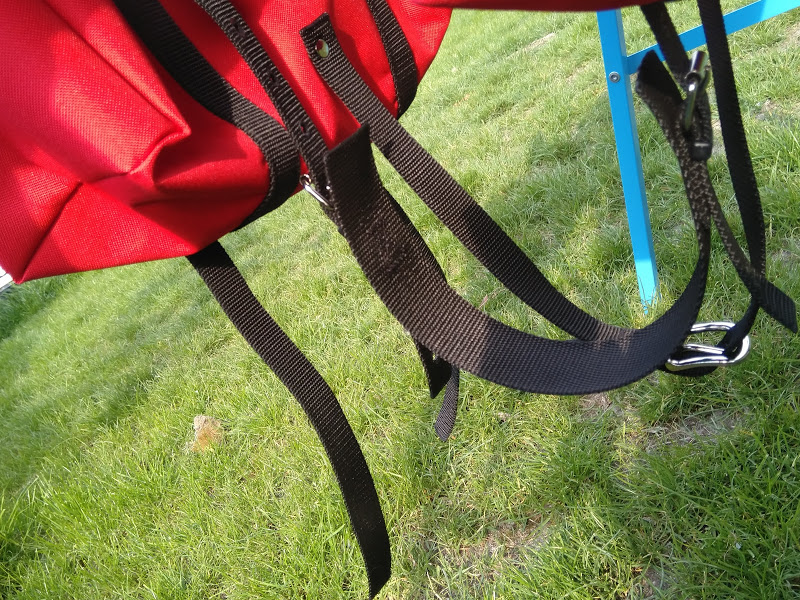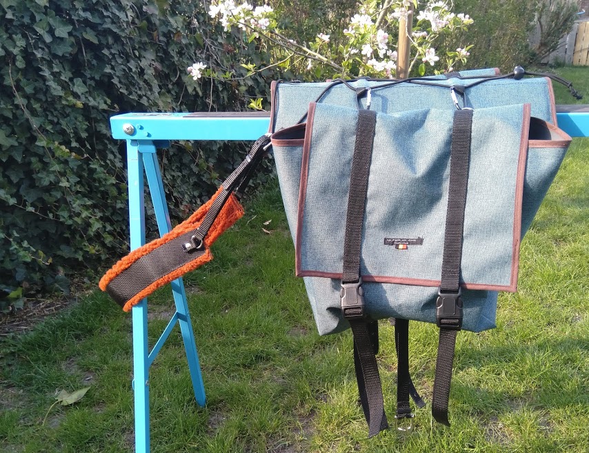 Ce mini-sakado est minimaliste mais, comme d’habitude, confortable, pratique et solide. Il est composé d’une sangle en jute naturelle et de sacs intégrés (non-amovibles) en jute également. Attention qu’ici c’était un test, les sacs sont normalement également en couleur naturelle et fermés par un cordon. Le garrot est protégé par deux matelassures XL en mousse et la sangle est réglable (mais il vaut mieux fournir le tour de bidou de l’animal, pour être au plus juste)