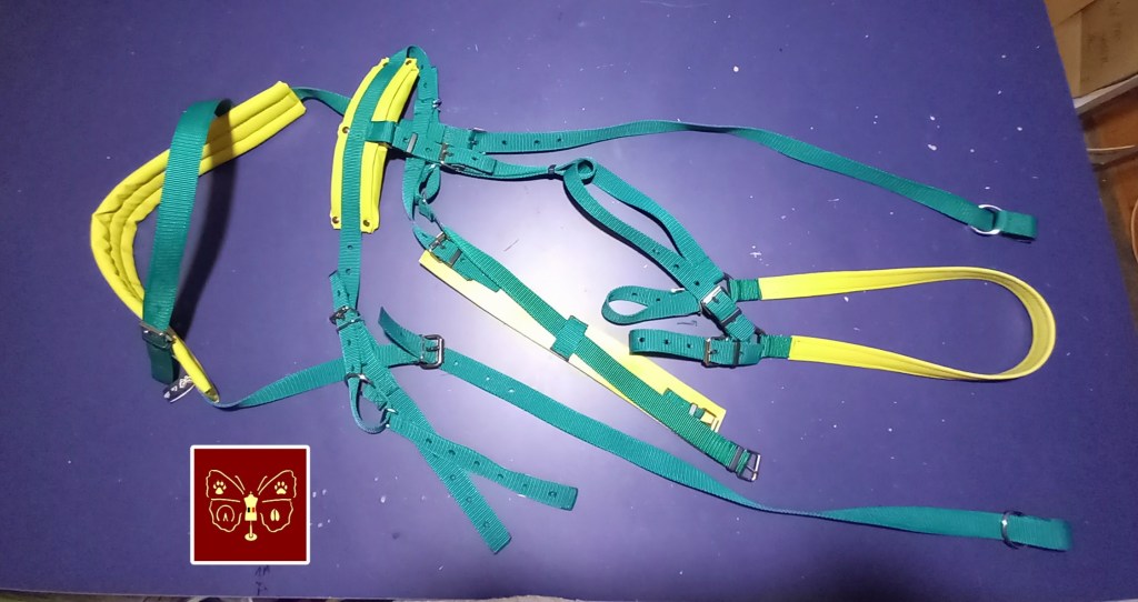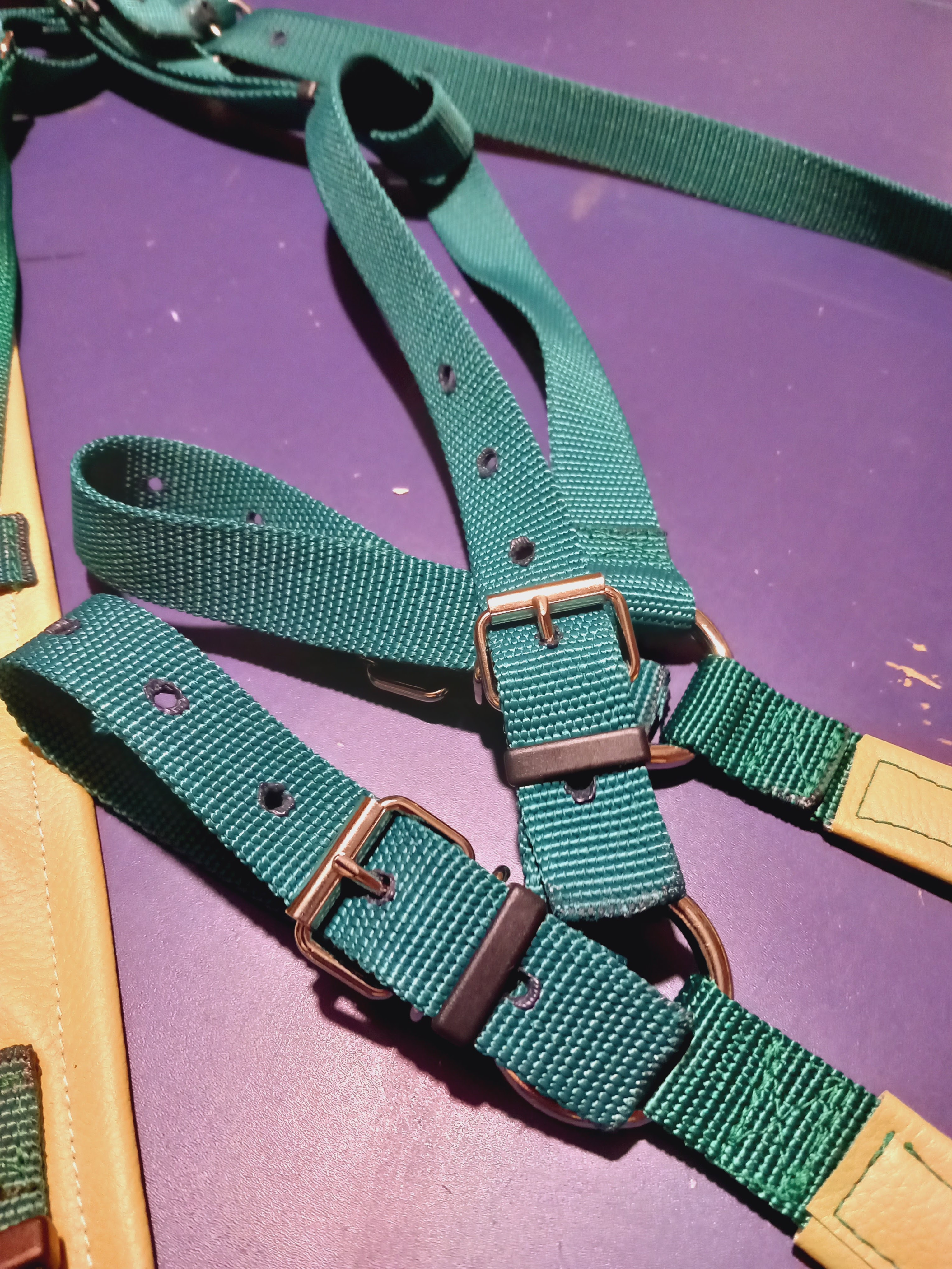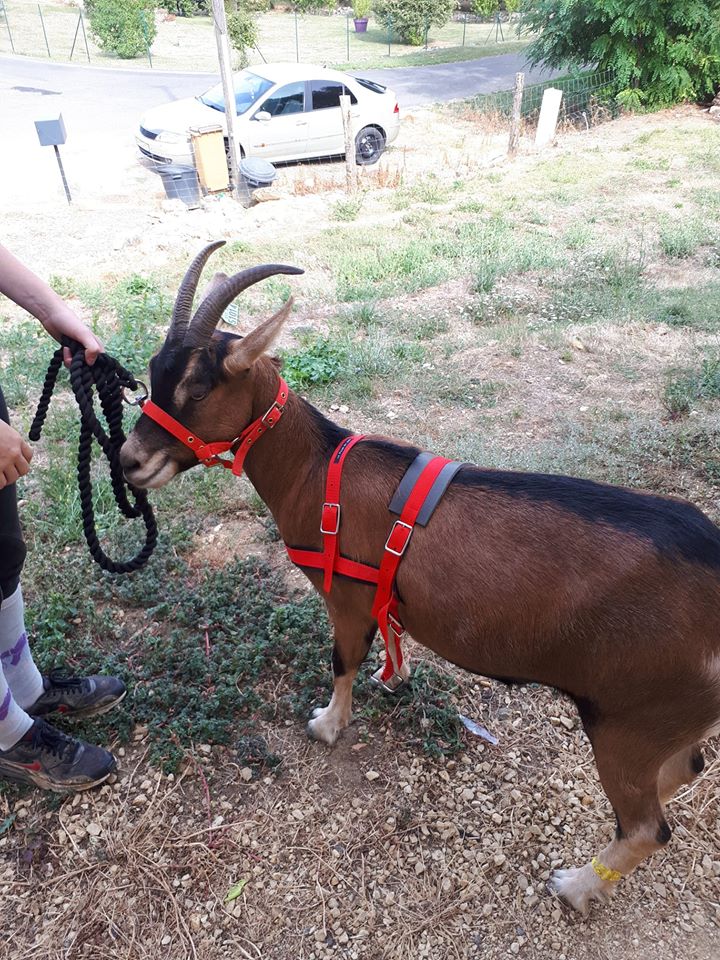 Ici, je vous propose un harnais simple, solide et fonctionnel, adapté à la morphologie des chèvres ou mouton, à utiliser en simple ou en paire, un licol ou un sidepull « spécial ruminant » et une « crottinette » pour récupérer leurs crottins et éviter les ennuis dans les endroits forts fréquentés