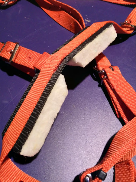 Sur mesure mais réglable (voir photo des mesures à prendre plus bas sur la page), couleur au choix, sangle de 25mm, boucleries en métal, doublé à la bricole par de la moumoute (ou un pad matelassé pour la version « luxe »), matelassures au garrot, avec traits.