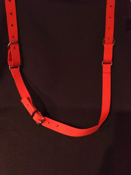 NOUVEAU: Pour les chèvres vraiment bien dressées et à mener par derrière, je peux placer des anneaux à la sellette, fournir des guides (longues-rênes) et mettre des anneaux à un licol pour en faire un sidepull (voir plus bas)