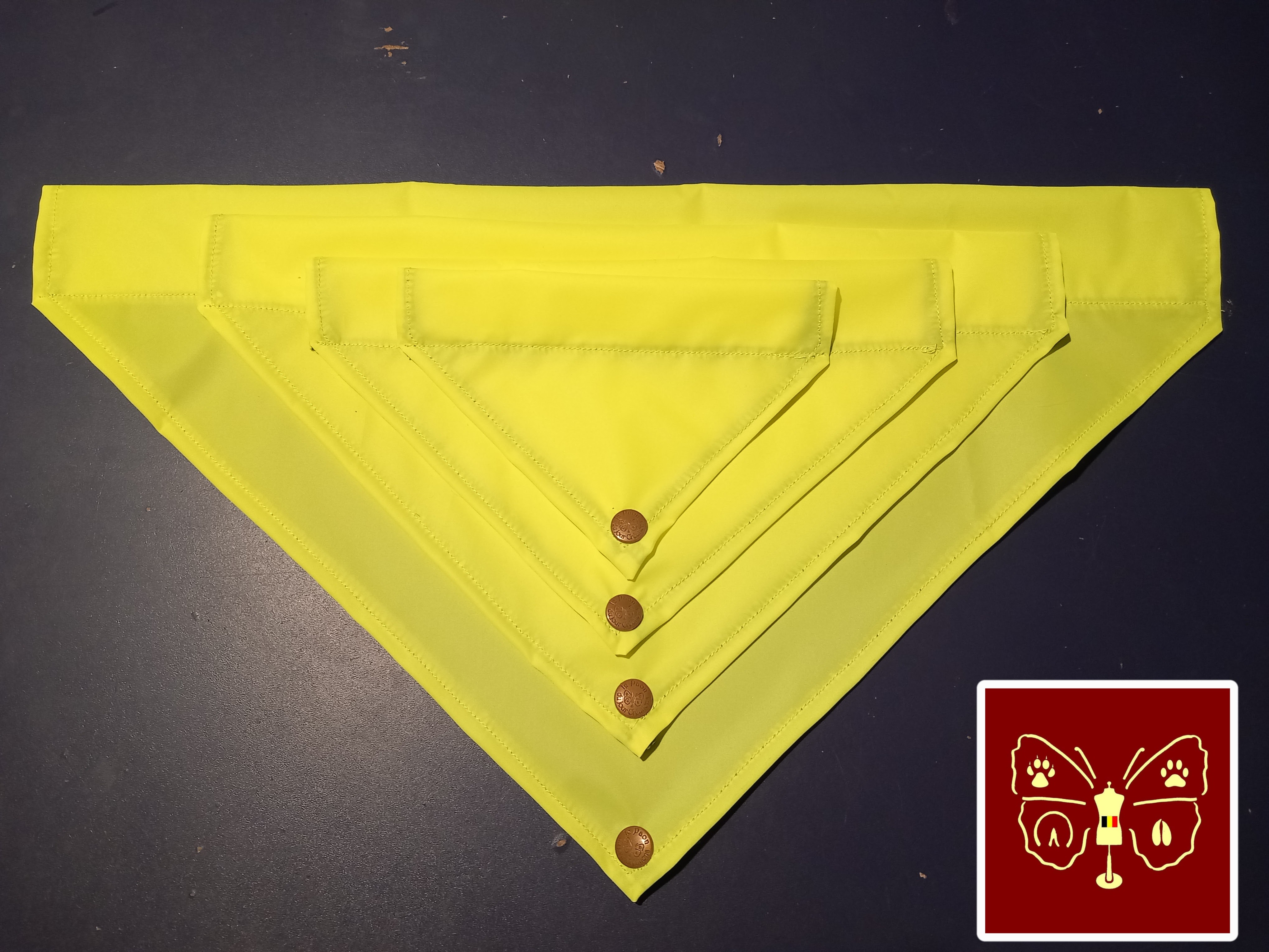 En polyester rose, bleu ou fluo, jaune, vert ou orange avec bandes réfléchissantes. A passer sur le collier ou à attacher avec un bouton-pression
