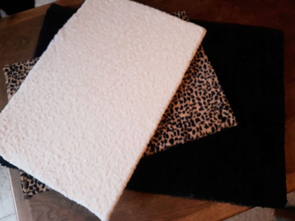 Dessus en polaire, pilou (fourrure synthétique) ou mouton* (couleur au choix), dessous en tissu anti-dérapant, intérieur en ouatine, épaisseur de +/- 2cm. Possibilité d’une plaque de mousse de 1cm pour l’intérieur.
