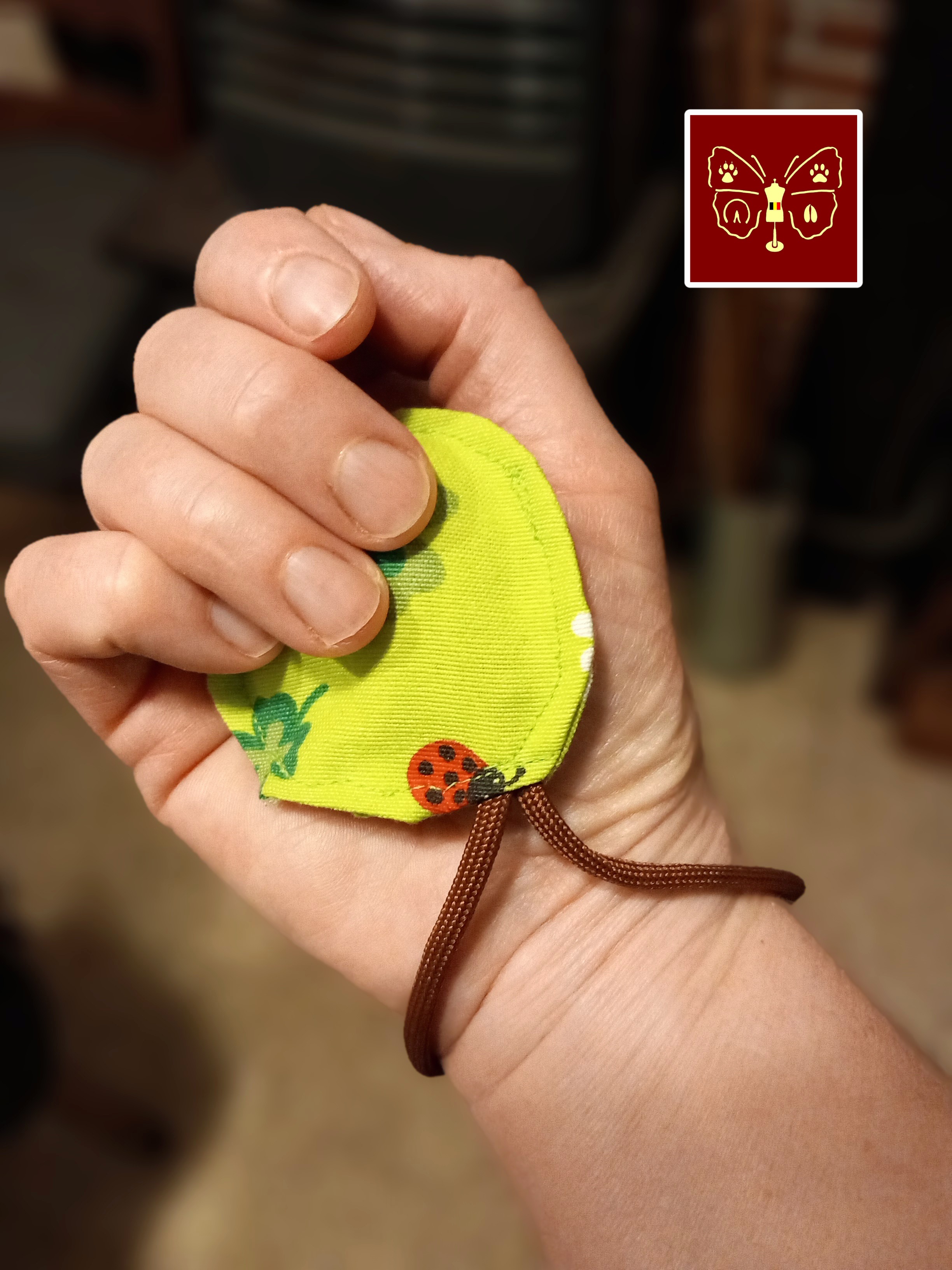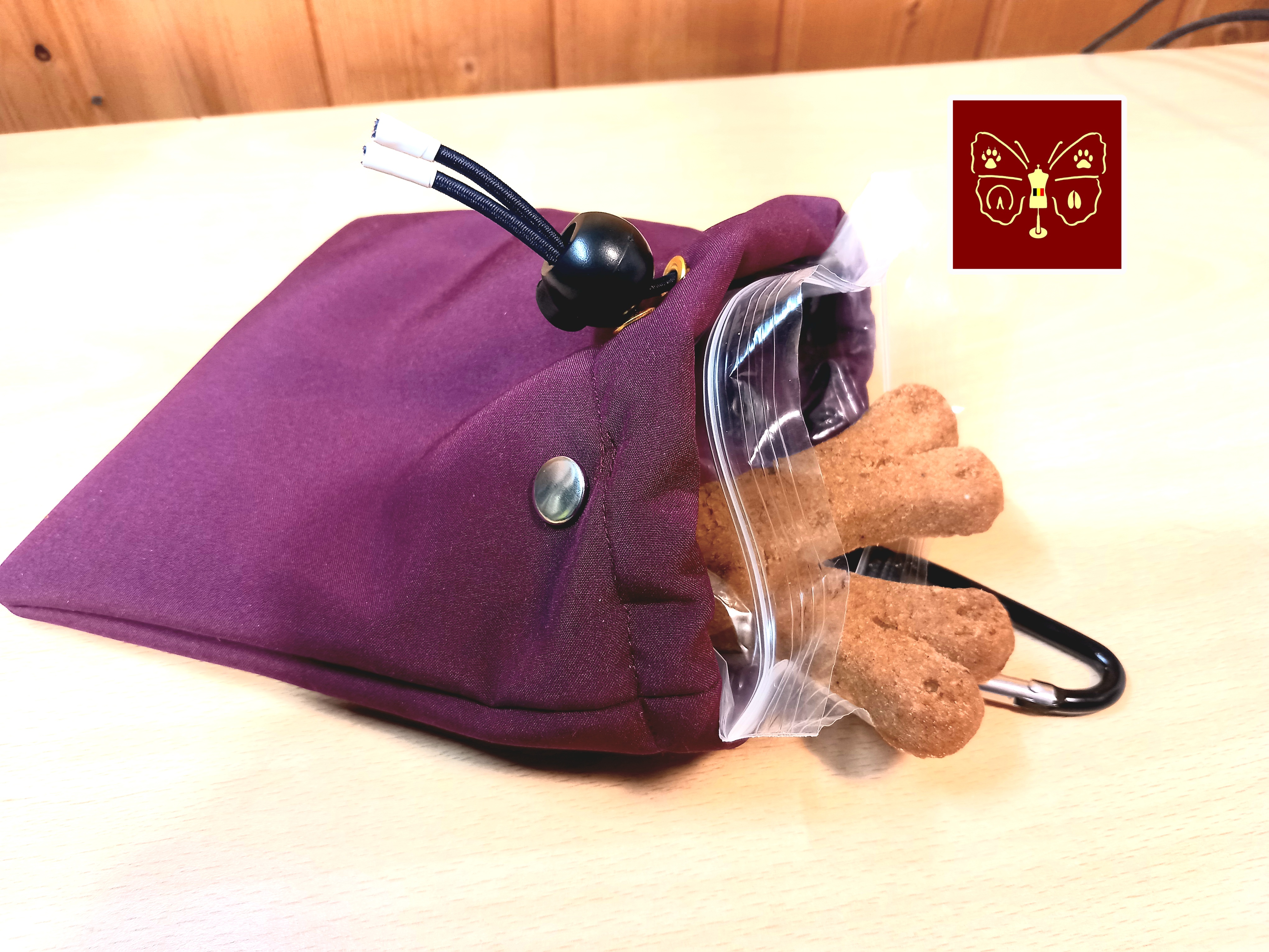 La différence avec celles que vous pouvez trouver ailleurs (commerce ou créatrices) c’est que j’ai ajouté à celle-ci des boutons pressions pour fixer n’importe quel sachet plastique (lavable ou jetable), refermable ou non, afin de pouvoir utiliser des friandises naturelles (miam les bons cœurs de poulet ou morceaux de poisson)