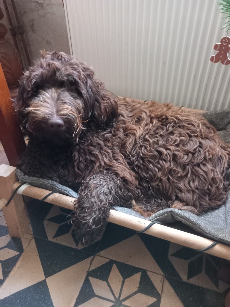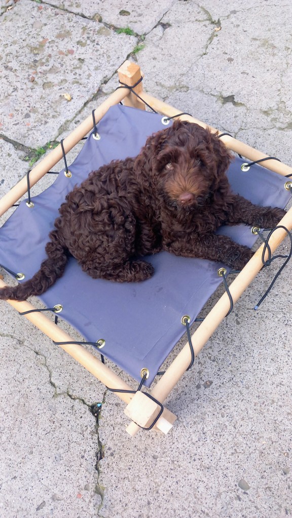 Cadre en bois démontable d’une hauteur approximative de 15 cm, une toile solide avec œillets, fixation de la toile par un gros élastique et possibilité de commander un coussin douillet en option , que demander de plus pour faire des gros dodos à l’abri des courants d’air?