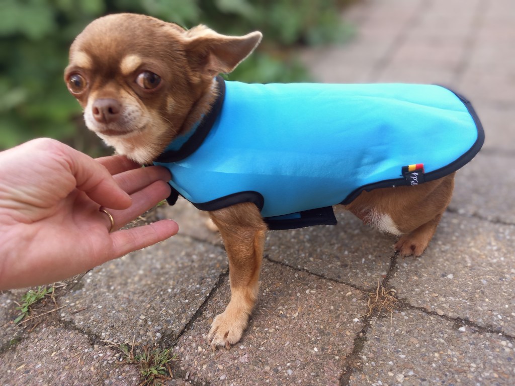 Le confort protège en plus les flancs, le cou avec un « turtle neck » repliable, le poitrail entre les pattes et est doté, pour les vestes et manteaux, d’une sangle abdominale couvrante avec fermeture par clip ou velcro sur le dos et d’un élastique de queue (ou d’élastiques aux pattes arrières). Il dispose aussi de pinces diverses pour épouser parfaitement la morphologie de votre chien ainsi qu’une fente sur le dos OU sur la nuque pour pouvoir passer l’anneau du harnais ou du collier.