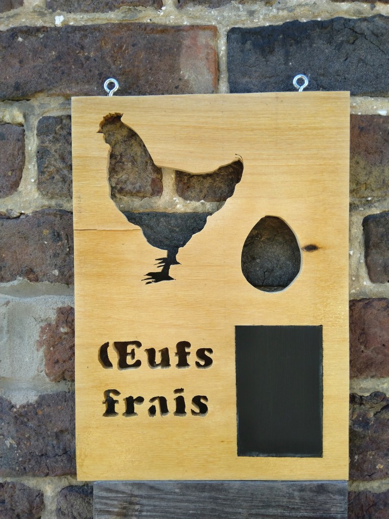 Panneau VERNI »œufs frais » 20cm x 30cm, avec petit tableau noir pour vos annotations : 25€