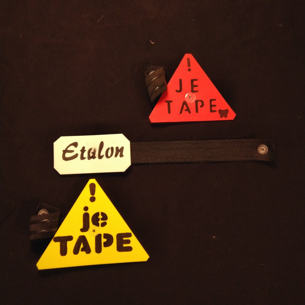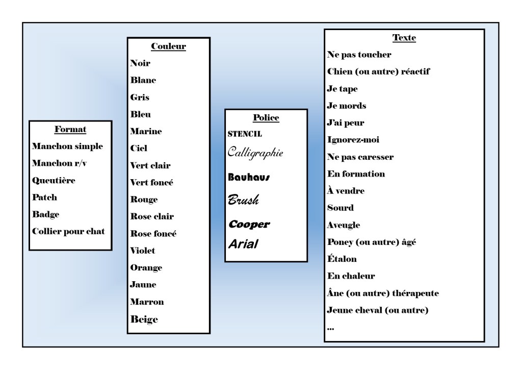 En mousse ultra légère et résistante (couleur au choix), toute sorte de texte court peut y être apposé à l’encre indélébile, résistante à l’eau et aux UV. Ils peuvent alors être fixés au licol, bridon, harnais, laisse, queue, etc… grâce à des velcros, un élastique anti-dérapant ou un mini-mousqueton.