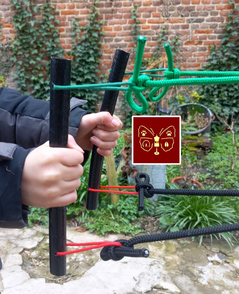 Au milieu, une corde avec un nœud de cabestan, auto-serrant.
