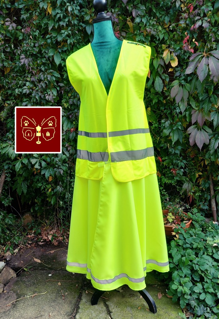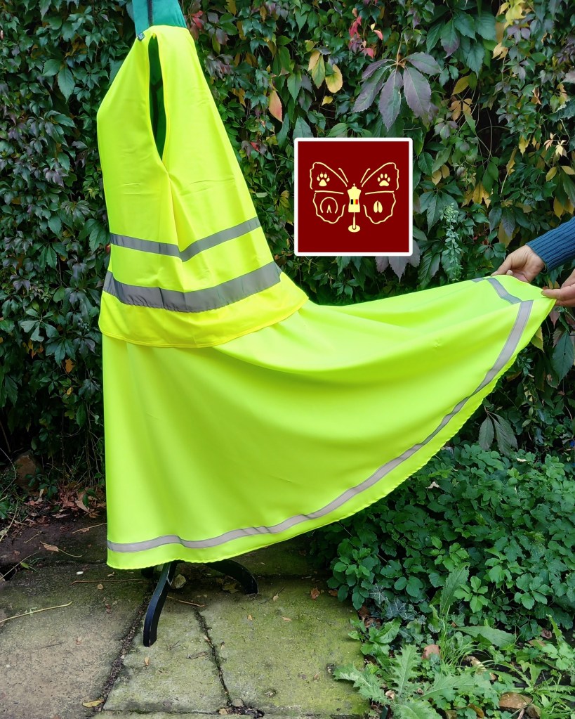 En polyester très léger (non-imperméable), rose, orange ou jaune fluo AVEC bandes réfléchissantes, en modèle jupe classique ou robe à porter au dessus de vos vêtements