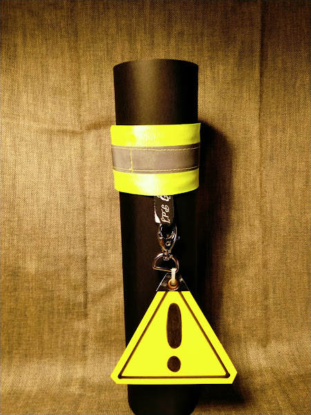 Large bande fluo et réfléchissante, cousue sur un élastique avec bandes antidérapantes, fermée par un velcro. Peut se porter seule, avec un badge en mousse* ou avec un lampe** LED (en option, voir plus bas pour les explications)). Sur mesure, couleur au choix