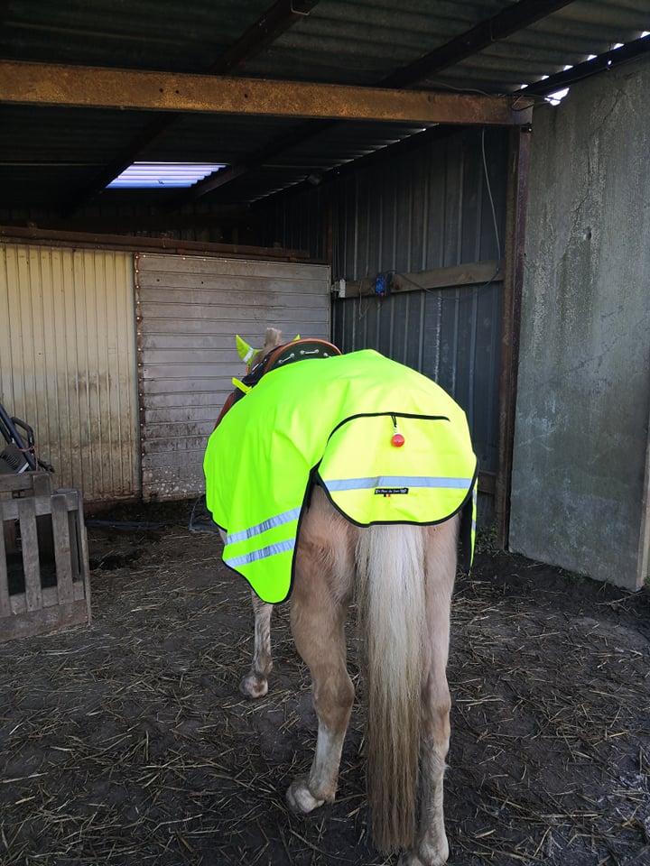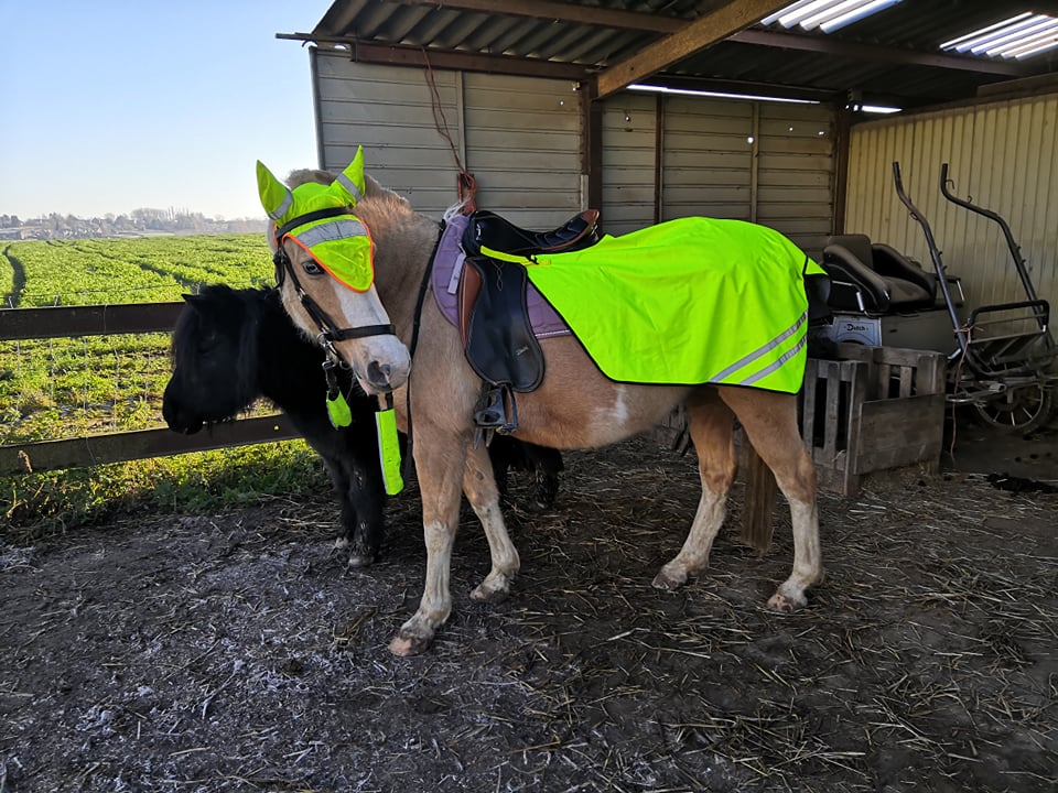 En taille shetland/mini, poney, cheval ou sur mesure. Possibilité d’ajouter une ou plusieurs bandes réfléchissantes à d’autres confections (couvre-reins, tapis, guêtres, etc…)